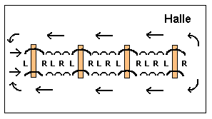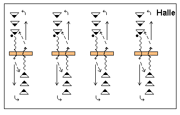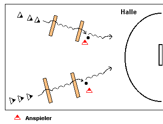 Erwärmung / Einstimmung (ca. 10 min. / ein Handball / Parteibänder / Matten) "Mattenball": Zwei Mannschaften spielen gegeneinander. Die Spieler einer Mannschaft passen sich den Ball untereinander zu und versuchen, einen eigenen Mitspieler auf der Matte (die nicht verlassen werden darf) anzuspielen. Immer wenn der Mattenspieler den Ball korrekt gefangen hat und ihn danach an einen anderen Mitspieler zurückgepasst hat, gibt es einen Punkt. Wird der Ball von der gegnerischen Mannschaft unter Kontrolle gebracht, so versucht diese ihrerseits mit geschickten Pässen möglichst viele Punkte zu erzielen. (Abb. 1) Hauptteil / Erarbeitung (ca. 20 min. / pro Gruppe einen Ball) A: Schulung des Anlaufs (Dreischrittrhythmus)