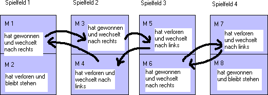 gespielt. Die Gewinner jeder Runde rücken ein Spielfeld